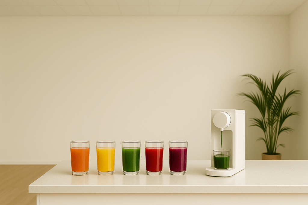 A compact dispenser that turns natural concentrate pouches into fresh wellness shots in just 3 seconds.